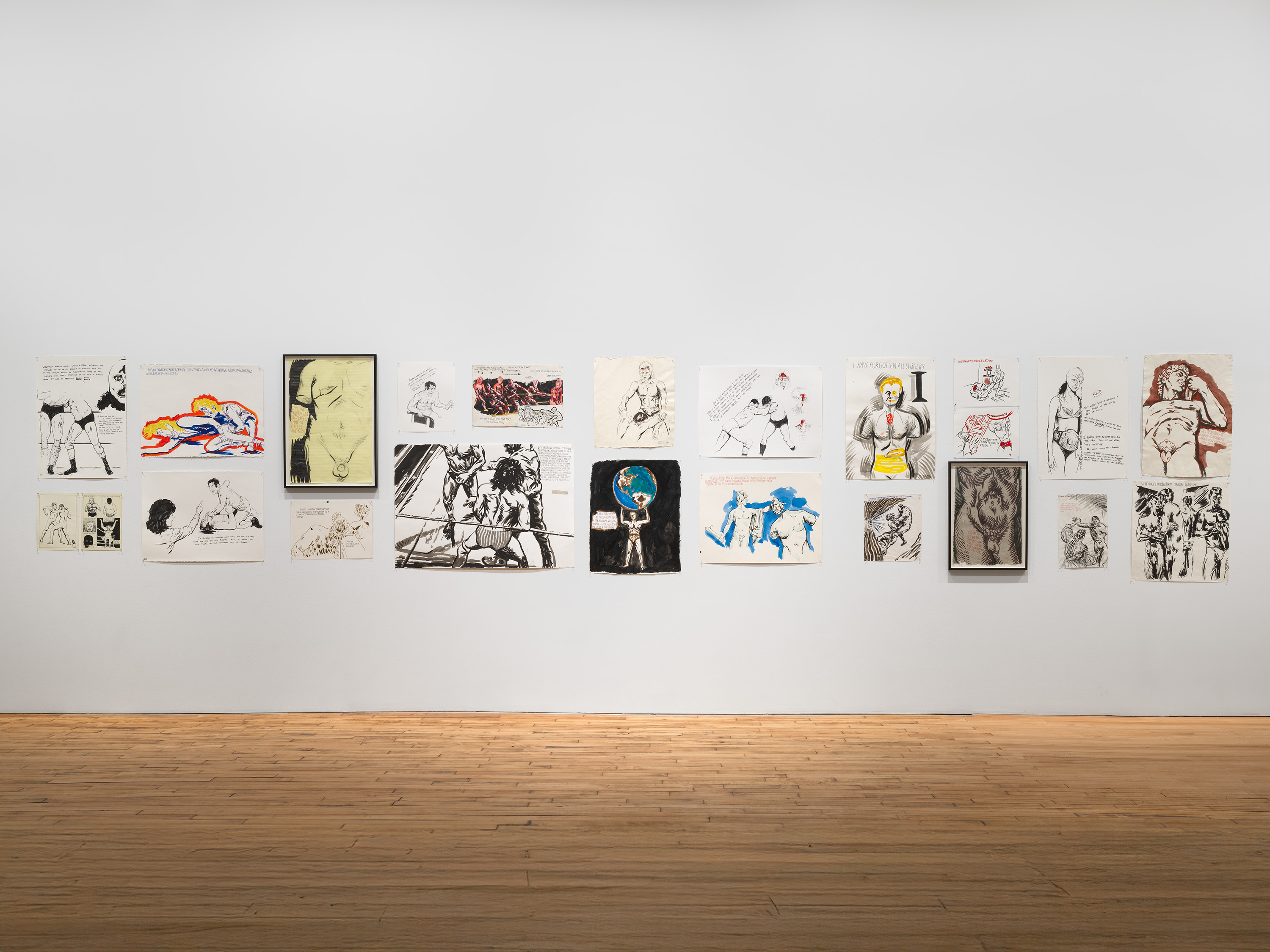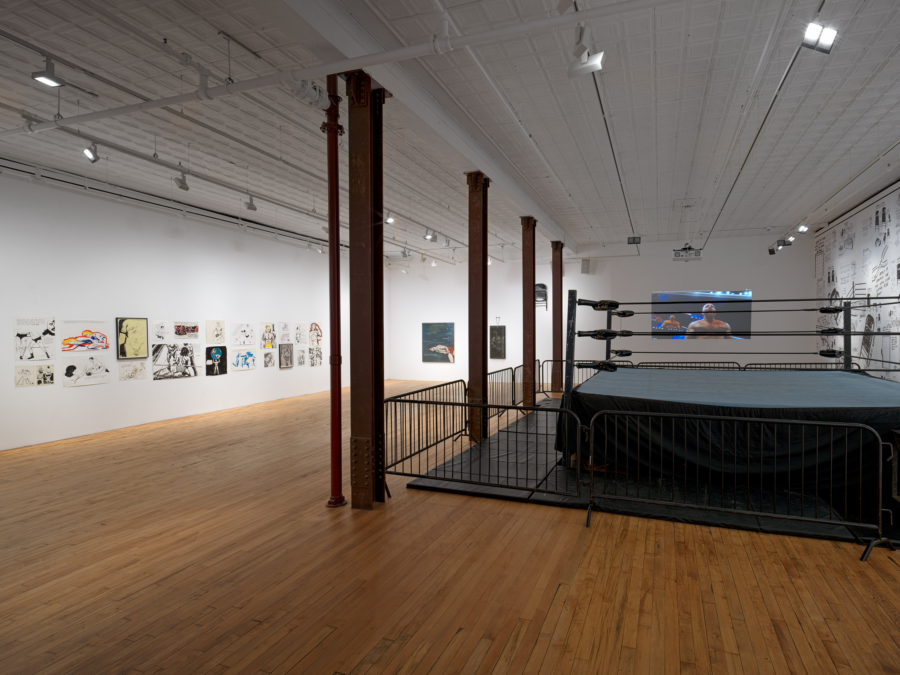 52 Walker and Awesome Championship Wrestling are pleased to announce 52W HARDWAY, the gallery’s “sixteenth-and-a-half” exhibition, which will feature drawings by Raymond Pettibon related to his lifelong interest in professional wrestling. Organized by Ebony L. Haynes, this two-week-only presentation—part exhibition, part event—will also see Pettibon’s friend and former two-time AEW (All Elite Wrestling) TNT Champion Darby Allin perform in live wrestling matches occurring on October 3 and 10 inside a ring installed within the gallery during the run of the show. Each performance night will also include live music and undercard bouts, organized by Allin, spotlighting up-and-coming figures in the sport. On view alongside Pettibon’s works will be drawings and wrestling props created by artist, designer, and wrestling specialist Charlie Ramone, who is widely known in the sport for his pivotal behind-the-scenes roles.